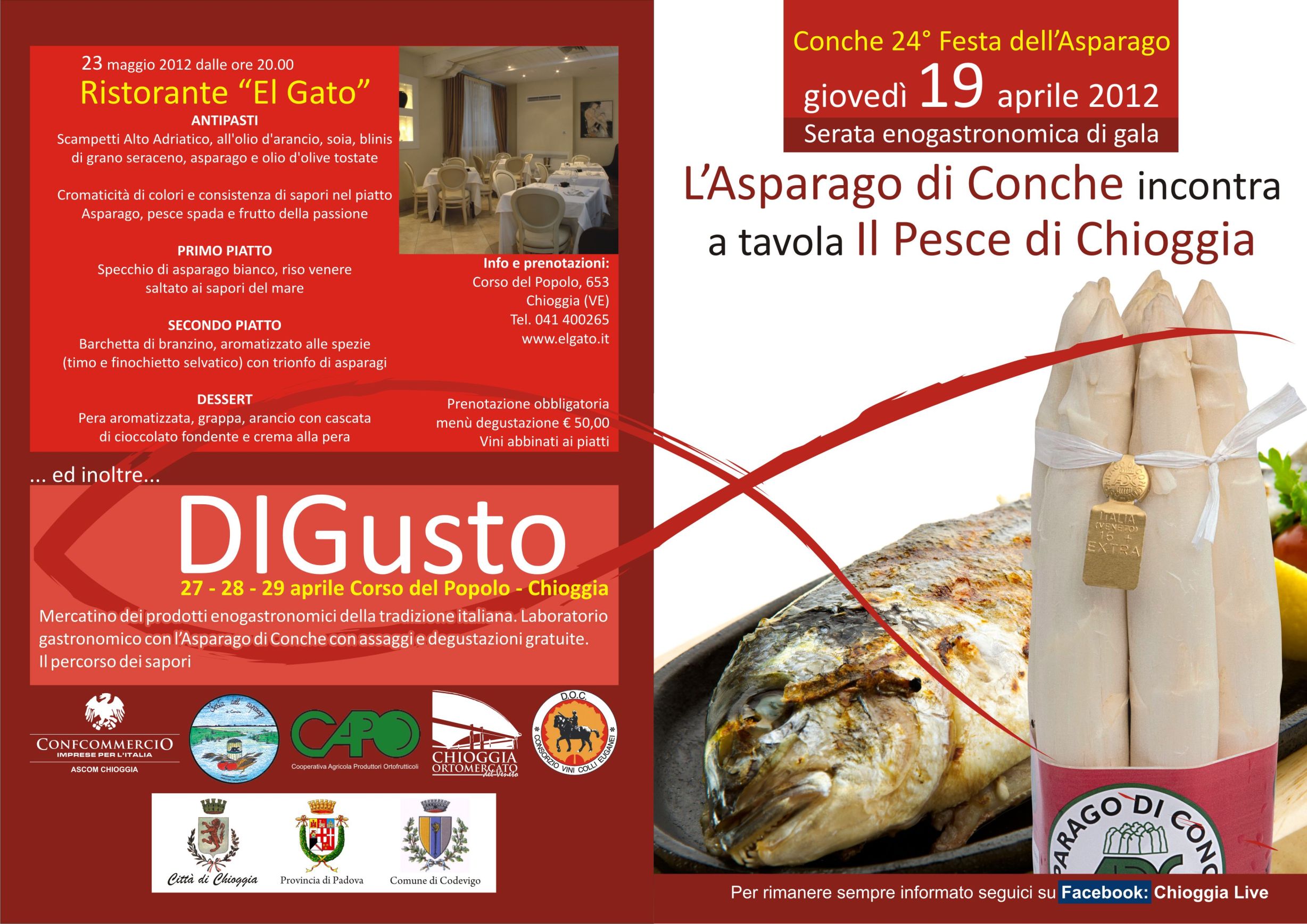 Ad aprile, serata enogastronomica di gala. Si inizia con la cena di gala “L’Asparago di Conche incontra a tavola il Pesce di Chioggia” prevista giovedì 19 aprile, ore 20.00 in occasione della 24ª Festa dell’Asparago-Conche di Codevigo (PD)” nella quale i ristoranti chioggiotti “El Fontego”, El Gato” e “Garibaldi” presentano i piatti della tradizione di pesce elaborati per esaltare il gusto e il sapore delicato dell’Asparago di Conche, che verrà elaborato anche in dessert dalla gelateria artigianale “Sottozero”. Il tutto sarà accompagnato dai nobili vini Doc del Consorzio Colli Euganei. Costo 35 euro, prenotazioni entro il 16 aprile Confcommercio 338.2271707 oppure Capo 049.5845293.