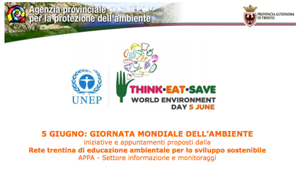 La Rete trentina di educazione ambientale dell’Agenzia provinciale per la protezione dell’ambiente, Settore informazione e monitoraggi, partecipa a questa importante giornata con diversi appuntamenti e momenti di riflessione, volti a sottolineare la necessità di un cambiamento verso un futuro più equo e sostenibile: laboratori di confronto con scambio di ricette antispreco, “eco-banchetti” informativi per essere aggiornati sui progetti provinciali “Ecoacquisti” ed “Ecoristorazione”, proiezioni di film a tema sono solo alcuni degli appuntamenti proposti per iniziare, anche a partire dai piccoli gesti quotidiani, a dimostrare un impegno comune per la protezione dell’ambiente. Programma manifestazioni scaricabile qui:Giornata mondiale ambiente Trento