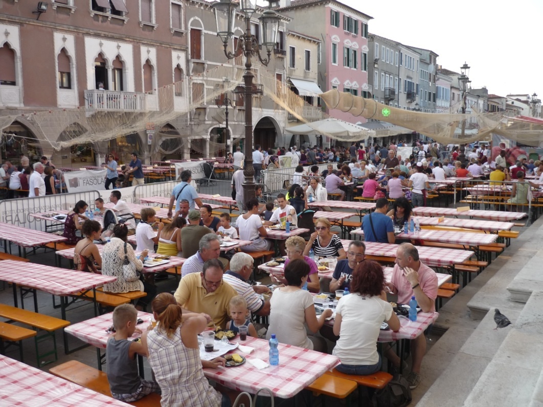 Tra fritti di pesce e cicheti. La kermesse apre ogni sera in corso del Popolo alle ore 19.30 nei ristoranti e negli stand allestiti dalle associazioni locali – ASI Ciao, Associazione Culturale Teatro e Musica, AUSER, I Fasolari, Masci, UISP, che deliziano i palati con le ricette più classiche come il “saor”, il fritto misto con polenta, le “bibarasse in cassopipa”, le seppie in umido con polenta e le immancabili grigliate di pesce. Inoltre davanti alla Cassa di Risparmio i ristoratori e panificatori dell’Ascom in collaborazione con la Fondazione Clodiense propongono i classici “cicheti” dalle ore 19.30 alle ore 21.30 con il progetto “Un territorio di sogni tra sapori e spettacoli”. Ogni sera dalle 21.30 nei due palchi allestiti in Campo Duomo e in Piazza Vigo si tengono spettacoli dimusica, spettacolo, teatro e cabaret. La Torre di Sant’Andrea, che conserva l’orologio da torre più antico del mondo, accoglie la mostra “I Dondi dell’orologio”, con la riproduzione di materiali e documenti d’archivio sull’attività della famiglia Dondi. Fino al 21 luglio, davanti a Palazzo Morari, c’è anche una mostra mercato sull’oro bianco di Cervia, il sale. Anche Europe Direct partecipa alla sagra con uno stand per la promozione della Rete Europea d’Informazione al servizio dei cittadini.
