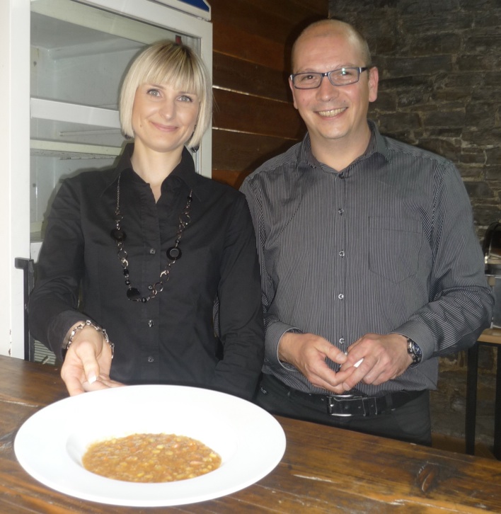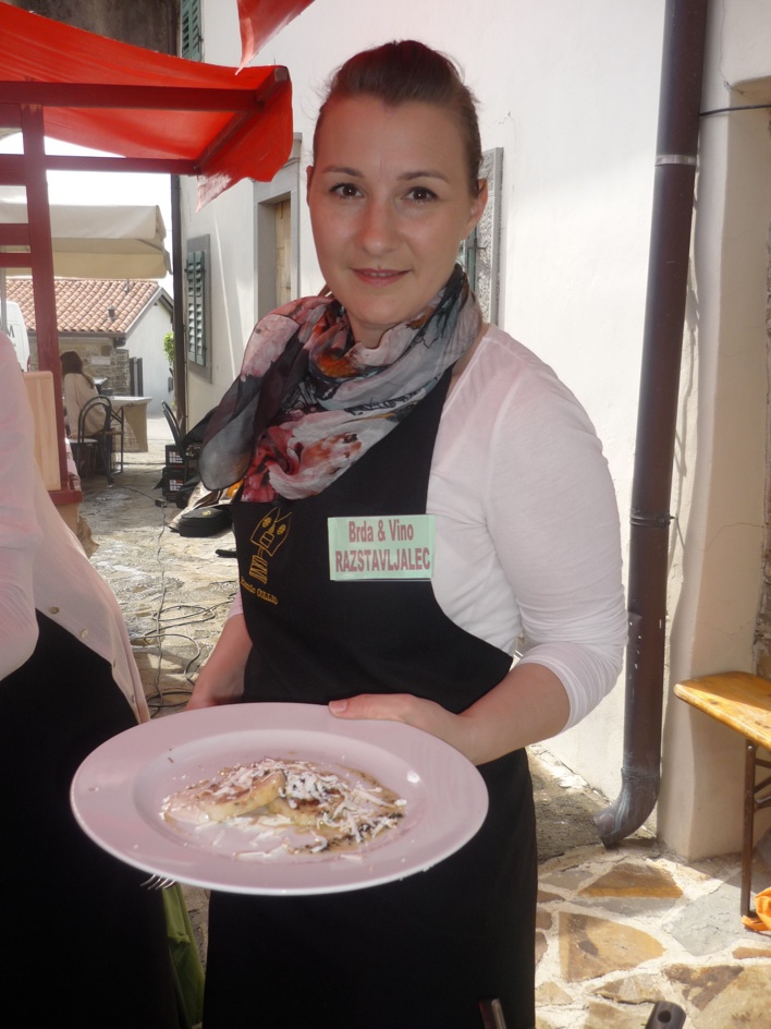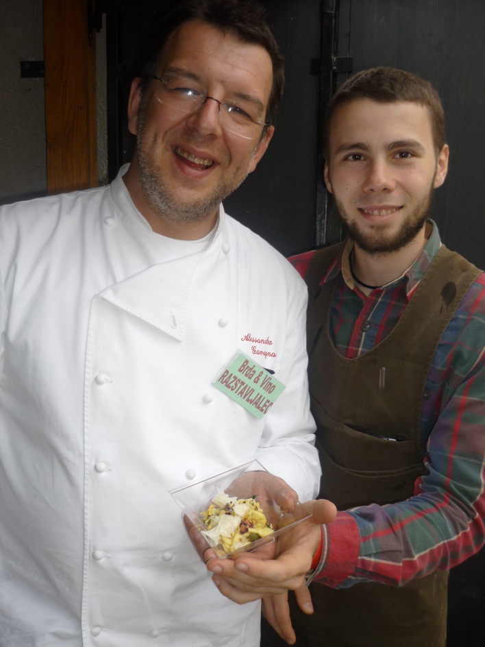 Un “assaggio” di più culture. Nell’impossibilità di riportare tutte le specialità culinarie e vinicole – slovene, friulane e anche bosniache – presentate in occasione della manifestazione, mi limito a ricordarne alcune: la Kozajnska Kuhnja, un gustoso minestrone a base di prosciutto, mais, carote, patate e fagioli preparato dal ristorante dell’Hotel Kozana, i “girini “, briciole di pasta all’uovo conditi con erbe aromatiche di stagione proposti da La Subida di Cormons (GO), il prosciutto crudo della locanda “Marica” di Smartno, le prelibate confetture di Zarko Matuc di Dobrovo (email zarko.matuc@amis.net), i formaggi alle erbe e lo yogurth bio dell’azienda agricola Zgajnar di Postojna, lo strucolo, strudel ripieno alle erbe di campo con cuore di Montasio, condito con burro e salvia e ricotta affumicata dell’osteria Korsic di San Floriano del Collio.