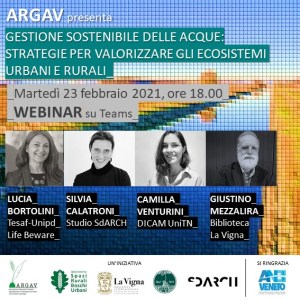 Interventi. Introduce il webinar: Lab. Spazi Rurali & Boschi Urbani. Relatori: Camilla Venturini – neolaureata in Ingegneria edile-architettura Università di Trento, Paesaggio come sistema di valori: una cintura verde e blu per Vicenza; Lucia Bortolini Tesaf Unipd – Life Beware, Strategie di adattamento al cambiamento climatico e al rischio di alluvioni e allagamenti in aree urbane e rurali; Silvia Calatroni e Alessandro Trivelli – Studio Sdarch MI, Strategie e soluzioni per la rinaturalizzazione del territorio urbano (Make your city greener); Giustino Mezzalira – Biblioteca Internazionale “La Vigna”, Ripensare il rapporto con l’acqua nei territori rurali. Modera: Argav.