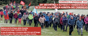 (di Toio de Savorgnani e Michele Boato, rispettivamente premio Argav 2016 e 2019). Domenica 9 novembre avrà luogo il 39° incontro di alpinisti e ambientalisti in difesa dell’antica foresta del Cansiglio. Quest’anno, l’incontro avverrà completamente nella parte friulana della foresta, con il raduno alle 9.00 al Passo della Crosetta (metri 1.127), partenza alle 9.30 lungo il sentiero CAI 991 che inizia dietro la grande casa forestale. Si passa per Casera Maset (1.274 ) e si arriva al Col dei S-cios (metri 1.374) alle 11.30-12.00. In caso di maltempo, il ritrovo è alle ore 10 all’hangar in Pian Cansiglio, 300 metri dietro il rifugio S. Osvaldo.