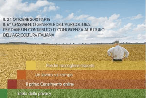 Motto: “raccogliamo risposte, seminiamo futuro”. Il Censimento agricolo, la cui prima edizione e’ stata lanciata nel 1961 e che quest’anno si presenta a cittadini e aziende con il motto ”Raccogliamo risposte, seminiamo futuro”, ”si inserisce in un percorso legislativo che guarda, in Europa, alla nuova Politica Agricola Comune che dovra’ essere elaborata entro il 2012 – ha sottolineato il direttore della direzione generale dell’Istat Andrea Mancini – ma anche, a livello nazionale, ai Piani di sviluppo rurale che in coerenza con essa dovranno essere varati”.