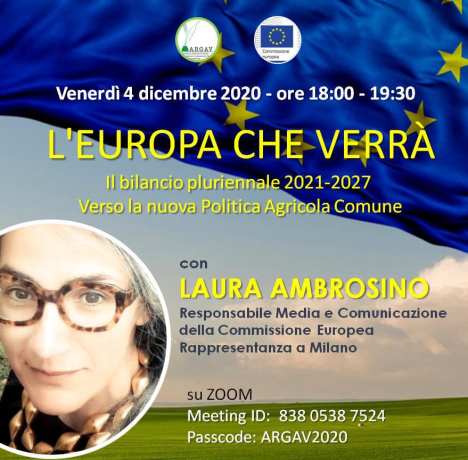 Prosegue l’attività di Argav on web: venerdì 4 dicembre 2020, dalle ore 18 alle ore 19:30, si svolgerà sulla piattaforma Zoom l’incontro “L’Europa che verrà, il bilancio Ue 2021-2027 e futura Pac“. Ne sarà relatrice Laura Ambrosino, responsabile media e comunicazione Commissione Europea rappresentanza a Milano. Per partecipare all’incontro, cliccare qui: