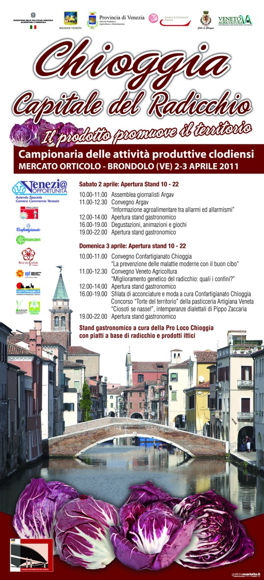 La giornata di chiusura. Domenica 25 si apre alle 9.30 con la Santa Messa, celebrata nel Padiglione Est dal vicario generale mons. Francesco Zenna, quindi alle 10.30 convegno Confartigianato: “Imprese senza tempo: analisi e insegnamenti dalle imprese attive da più di cento anni”, mentre alle 11.00 c’è un workshop sull’energia fotovoltaica. Nei pomeriggi di sabato e domenica sono previsti spettacoli di danza e moda, mentre uno stand gastronomico gestito dall’associazione Asi Ciao propone a pranzo e cena delle gustose specialità che coniugano radicchio con i prodotti della pesca. L’associazione San Rafael organizza “Un sorso di Solidarietà”, degustazione della birra artigianale “La Rossa di Chioggia“. I cancelli dell’Ortomercato resteranno aperti fino alle dieci di sera ed è disponibile ampio parcheggio.