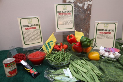 -1Il cahiers de doleance presentato nel Dossier Coldiretti su “I rischi del cibo low cost” è piuttosto lungo: una mozzarella su quattro non è realizzata con il latte ma partendo da cagliate straniere spesso provenienti dall’Est europeo;  proviene dall’Argentina quasi la metà dell’import dei limoni sul quale sono stati riscontrati problemi di trattamenti chimici;  sono raddoppiate le importazioni in Italia di imitazioni del Parmigiano reggiano e del Grana Padano Dop che non rispettano però’ i rigidi disciplinari; “wine kit” promettono prestigiosi vini italiani ottenuti da polveri miracolose (140.000 confezioni vengono addirittura realizzate in una fabbrica svedese);  nel 2012 sono stati importati in Italia 85 milioni di chili di pomodori “irregolari” per presenza di residui chimici, conservati in fusti che vengono rilavorati e diventano concentrato o sughi miracolosamente italiani;  nel 25% dei casi l‘aglio argentino che giunge in Italia è irregolare per la presenza di residui chimici;  in quattro bottiglie di olio extravergine su cinque in vendita in Italia è praticamente illeggibile la provenienza delle olive impiegate;  vi sono allarmi per l’importazione in Italia di nocciole e pistacchi dalla Turchia contaminati per la presenza di muffe e aflatossine;  nel 2012 sono aumentate del 38 per cento le importazioni di miele naturale dalla Cina (l’Ue ha lanciato un allarme sul rischio di contaminazione da organismi geneticamente modificati);  il 90% dei cosci venduti in Italia per il prosciutto cotto provengono da animali provenienti da Olanda, Danimarca, Francia, Germania e Spagna senza che questo venga indicato in etichetta;  in Italia nel 2012 sono aumentate del 12 per cento le importazioni di riso dagli Stati Uniti (rischio Ogm); in Italia arriva un flusso di milioni di chilogrammi di impasti per pane semicotti, surgelati, con una durata di 24 mesi, grazie ad additivi e conservanti, provenienti dall’Est europeo;  oltre la metà del grano duro utilizzato nella produzione di pasta è di importazione, con problemi di aflatossine; nel corso del 2012 sono stati importati in Italia quasi un milione di chili di succo d’arancia dal Brasile, con problemi per la presenza dell’ antiparassitario carbendazim.