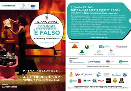 Teatro civile anti-contraffazione. Parte dal Veneto il progetto “Tutto quello che sto per dirvi è falso”. Spettacolo in scena il 4 ottobre 2013 al Teatro Goldoni di Venezia.