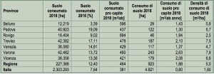 Il Veneto è la regione con gli incrementi maggiori +923 ettari, seguita da Lombardia +633 ettari, Puglia +425 ettari, Emilia-Romagna +381 ettari e Sicilia +302 ettari. Rapportato alla popolazione residente, il valore più alto si riscontra in Basilicata (+2,80 m2/ab), Abruzzo (+2,15 m2/ab), Friuli-Venezia Giulia (+1,96 m2/ab) e Veneto (+1,88 m2/ab).Il consumo di suolo in città ha un forte legame anche con l’aumento delle temperature: dalla maggiore presenza di superfici artificiali a scapito del verde urbano, infatti, deriva anche un aumento dell’intensità del fenomeno delle isole di calore. La differenza di temperatura estiva delle aree urbane rispetto a quelle rurali raggiunge spesso valori superiori a 2°C nelle città più grandi. A livello generale, lo screening del territorio italiano assicurato dal Sistema Nazionale per la Protezione dell’Ambiente segna in rosso altri 51 chilometri quadrati di superficie artificiale solo nel 2018, in media 14 ettari al giorno, al ritmo di 2 metri quadrati ogni secondo. Anche se la velocità sembra essersi stabilizzata, è ancora molto lontana dagli obiettivi europei che prevedono l’azzeramento del consumo di suolo netto (il bilancio tra consumo di suolo e l’aumento di superfici naturali attraverso interventi di demolizione, deimpermeabilizzazione e rinaturalizzazione).