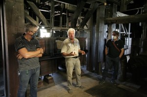 Cristiano Fenzi, presidente Ctg Rovigoti, mostra ai soci Argav il macchinario ottocentesco del mulino (foto Alessandro Bedin)