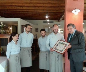 Riccardo De Marchi, titolare di Ca’ Landello, insieme al suo staff, riceve da Franco Zorzet il diploma di Buona Cucina dell’Accademia della Cucina Italiana