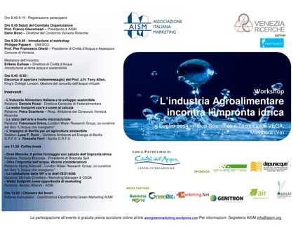 Relatori. In particolare, è proprio la crescente domanda di cibo e la necessità di un’agricoltura sempre più intensiva a provocare il 70% dei prelievi totali di acqua dolce superficiale e sotterranea, prelievi che portano l’impronta idrica dell’agricoltura ad incidere pesantemente rispetto a quelli determinati dall’industria e dal consumo diretto dei cittadini. L’industria alimentare e la disponibilità di questa risorsa sono dunque profondamente legate. L’incontro verrà aperto dai saluti di Franco Giacomazzi – presidente di AISM – e di Dario Bovo, direttore del Consorzio Venezia Ricerche. Numerosi i nomi di spicco fra i relatori presenti al workshop: fra gli altri, Francesca Greco e Marta Antonelli, autrici del libro “L’Acqua che mangiamo”; Philippe Pypaert, dell’UNESCO; il presidente di Civiltà d’Acqua e assessore al Comune di Venezia Pier Franceso Ghetti. Interverranno anche esponenti del mondo imprenditoriale, come Barilla e Brazzale.